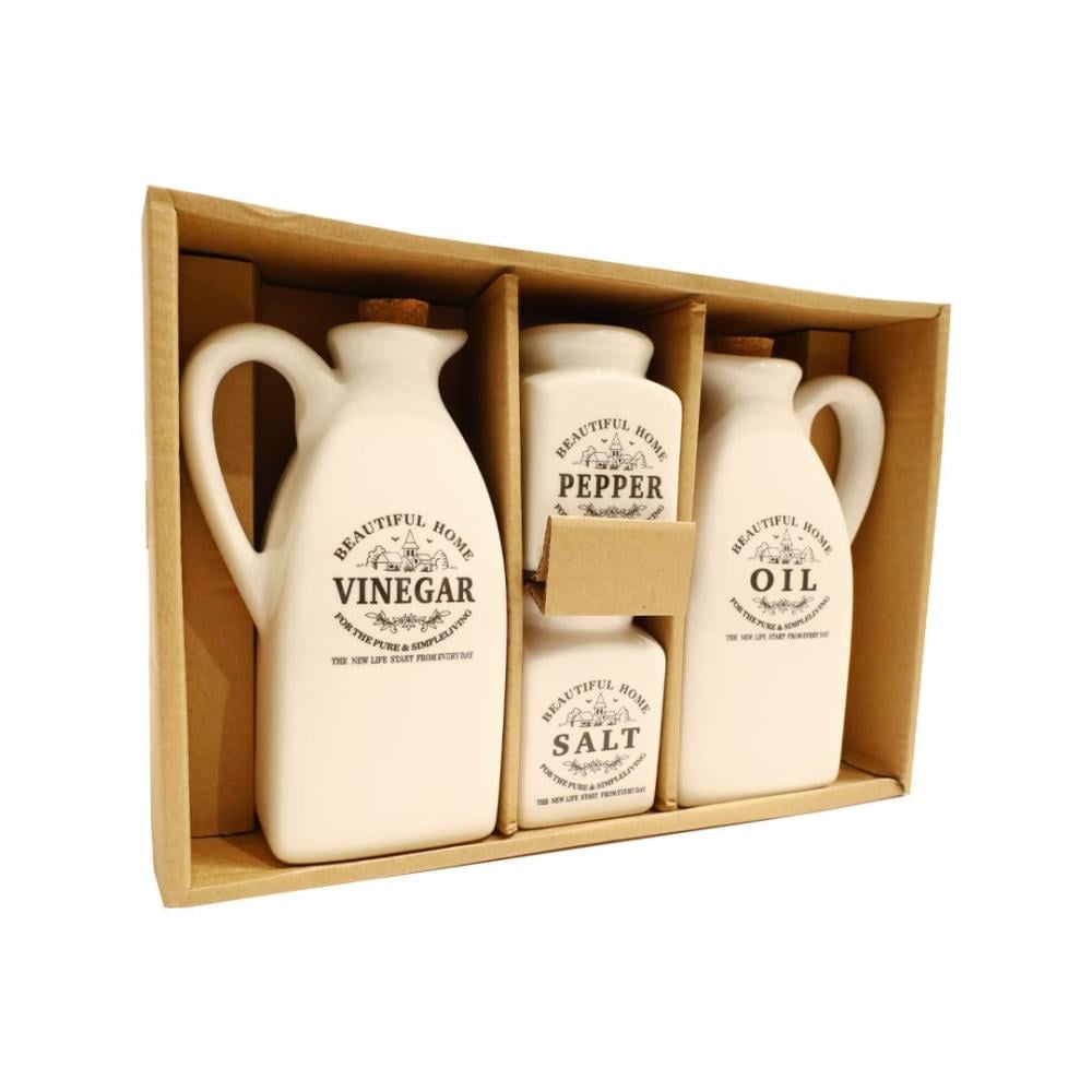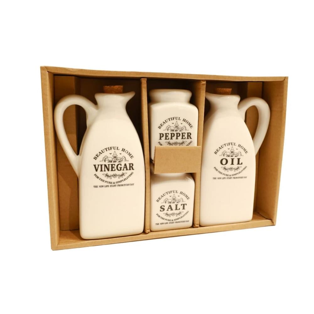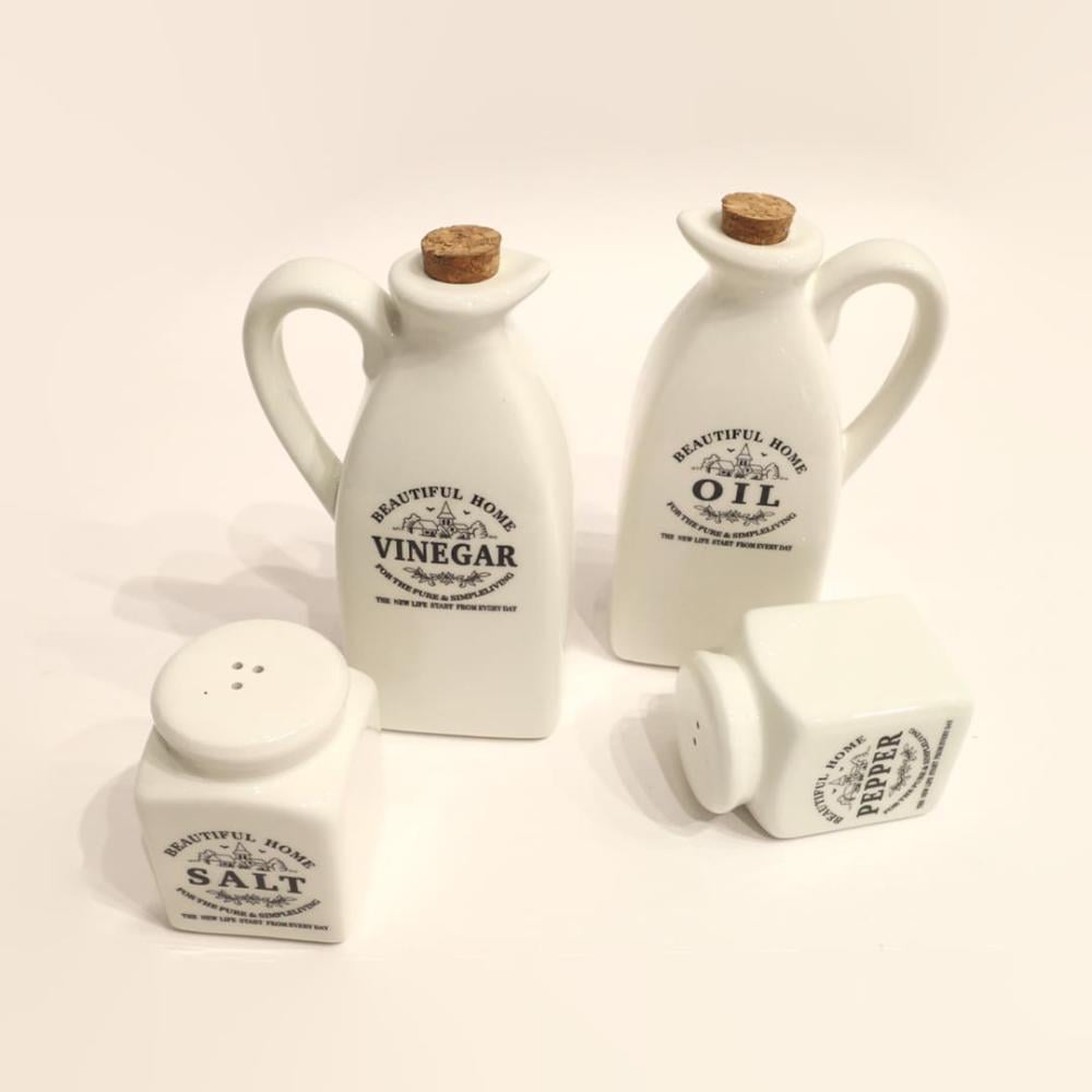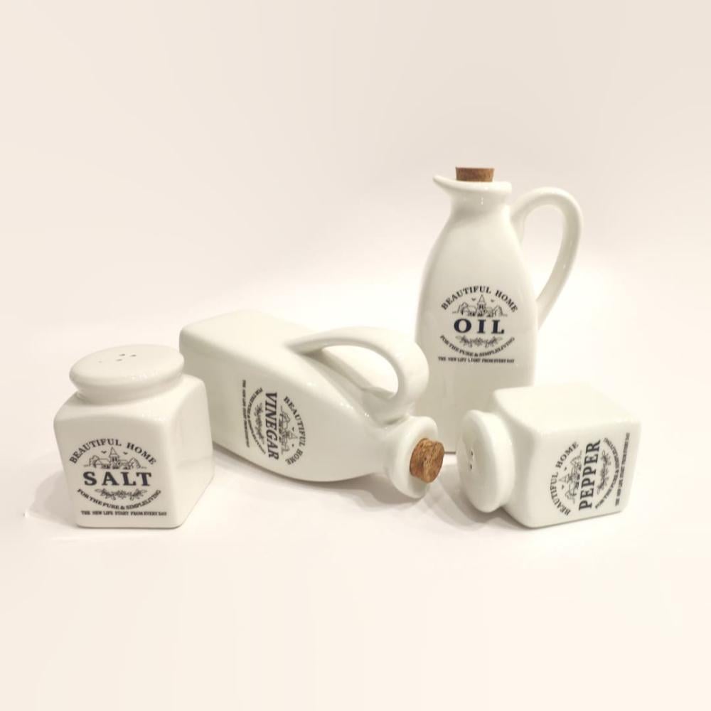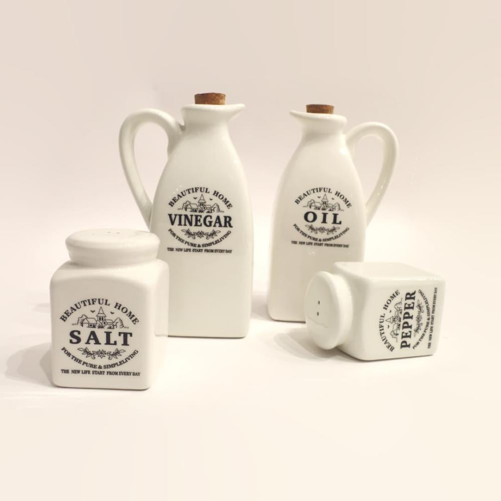 لمسة من الأناقة مع طقم عصري مصنوع من السيراميك عالي الجودة. يتكون من علب زيت وخل بالإضافة إلى علب بهارات بتصميم عملي وجذاب، يجمع بين الفائدة والجمال في نفس الوقت. مثالي لحفظ النكهات الأساسية بطريقة منظمة وأنيقة على طاولة الطعام أو داخل المطبخ